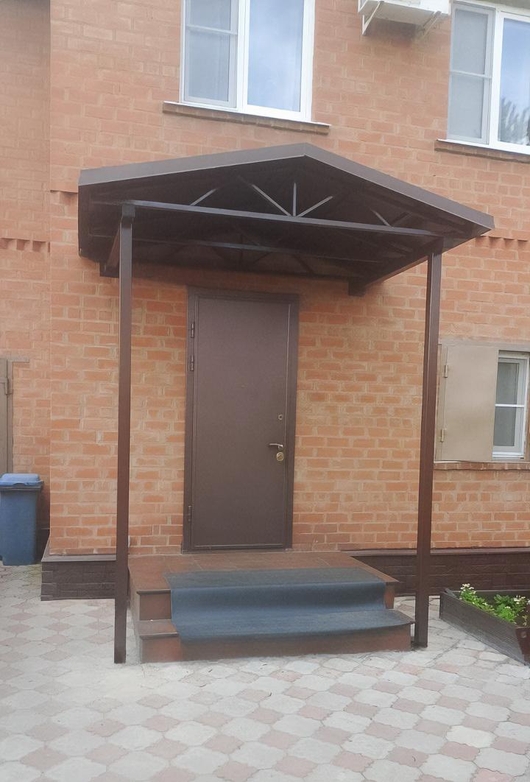 Двускатный навес из коричневого профнастила для входа в дом Арт-738