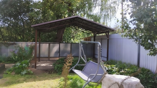 Навес двускатный из коричневого профнастила для зоны отдыха на даче Арт-696