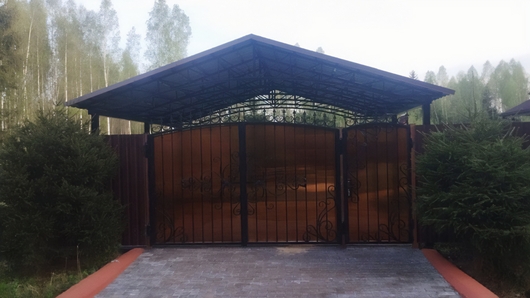 Навес двускатный с крышей из профнастила для стоянки машин Арт-719